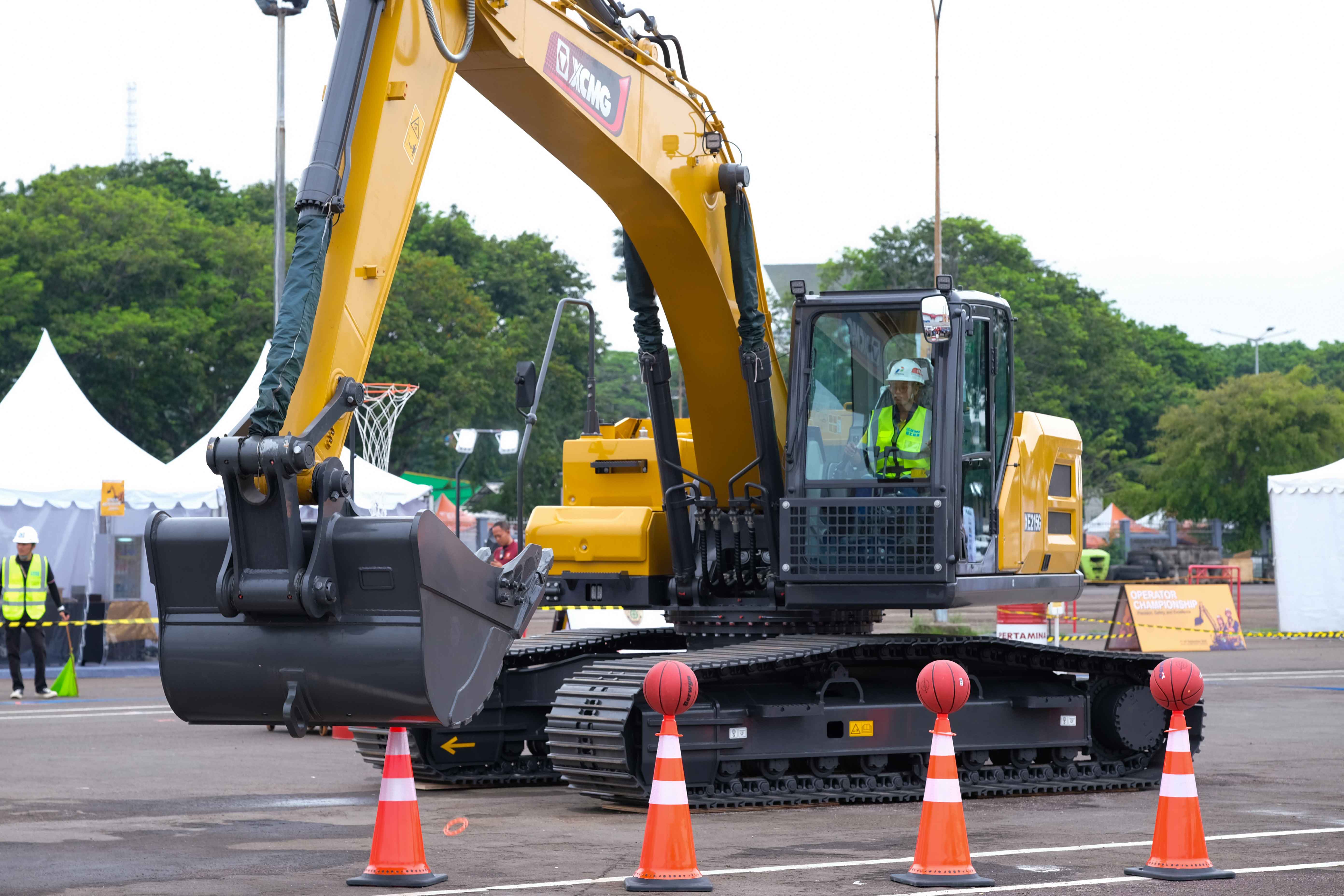 Each participant was given ten basketballs, placed on traffic cones on one side of the excavator. Using the excavator’s bucket, they had to scoop the balls off the cones, lift them, then swing the arm across to drop them into the goals on the opposite side. The sequence of goals was up to the operator. Whoever managed to score in all three goals first—or scored the most within ten minutes—was declared the winner. Before the session ended, the excavator bucket had to be returned to its original position: resting on a pad of stacked burlap sacks.